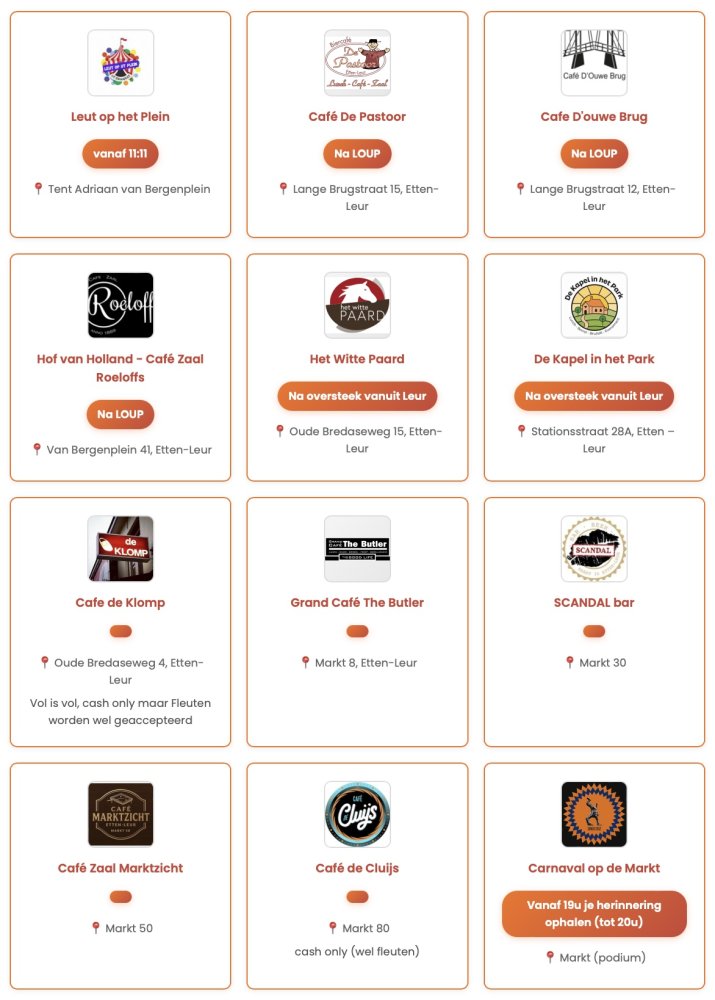 Elke kroeg wordt aangedaan en wie een volle stempelkaart inlevert, kan op de Markt in Etten een leuke beloning ophalen. Onderweg, vooraf én bij de afsluiting zorgen live optredens voor de juiste carnavalsstemming. De tocht wordt georganiseerd in samenwerking met Stichting Carnaval op de Markt en Leut op ut Plein.
