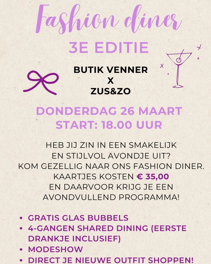 Donderdagavond 26 maart is het tijd voor het derde Butik Venner x Zus&Zo Fashion Diner! Wat mag je verwachten?