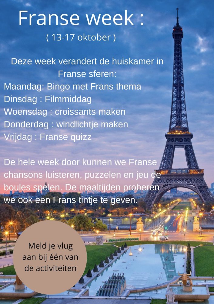 Van 13 t/m 17 oktober is de huiskamer Surplus De Linde in Franse sferen. Elke dag zijn er verschillende activiteiten. Samen met een maaltijd met een Frans tintje, onder genot van een Franse chanson, waan je je (bijna) in Frankrijk.