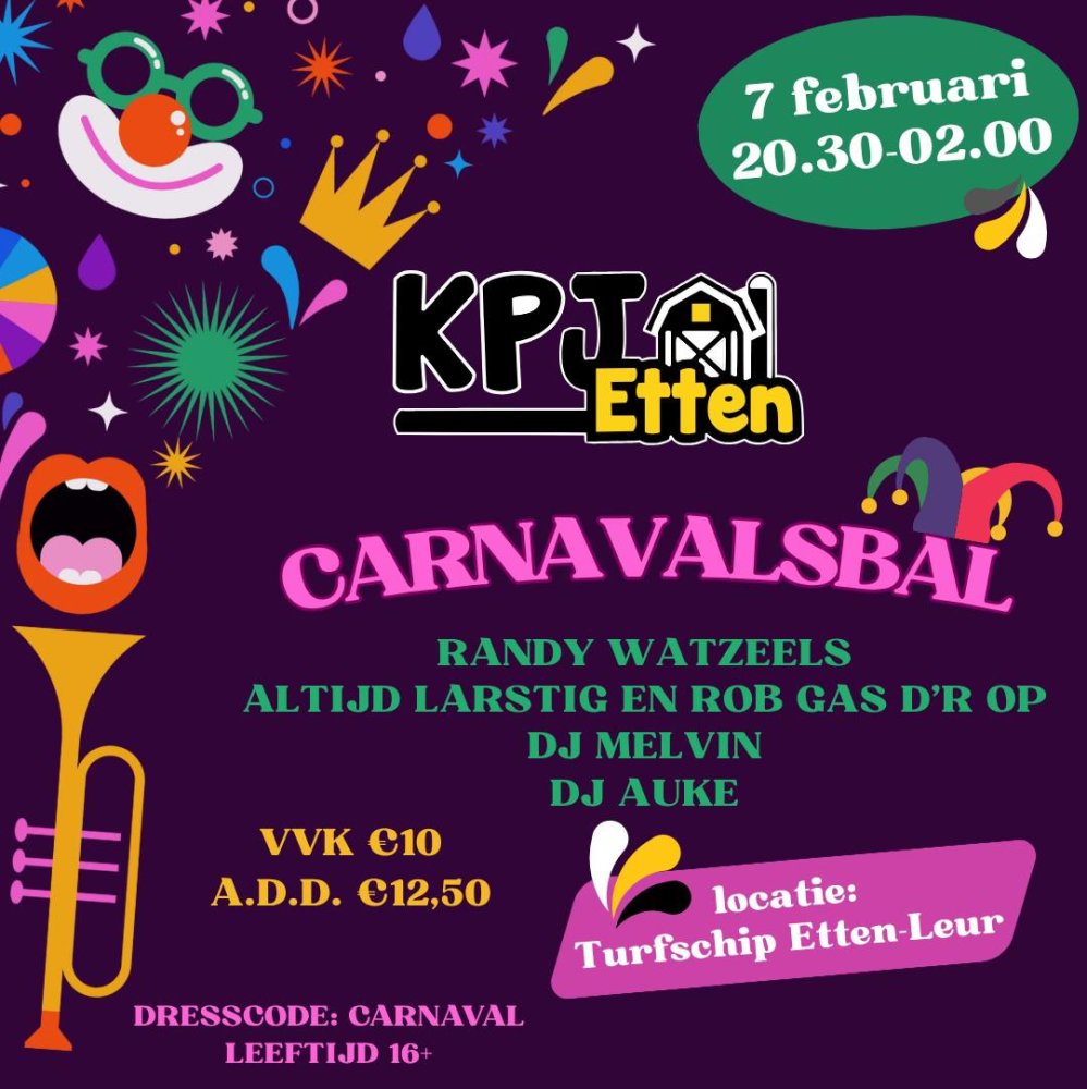 KPJ Etten houdt op 7 februari een groot carnavalsbal in Het Turfschip. Van 20.30-02.00 uur.