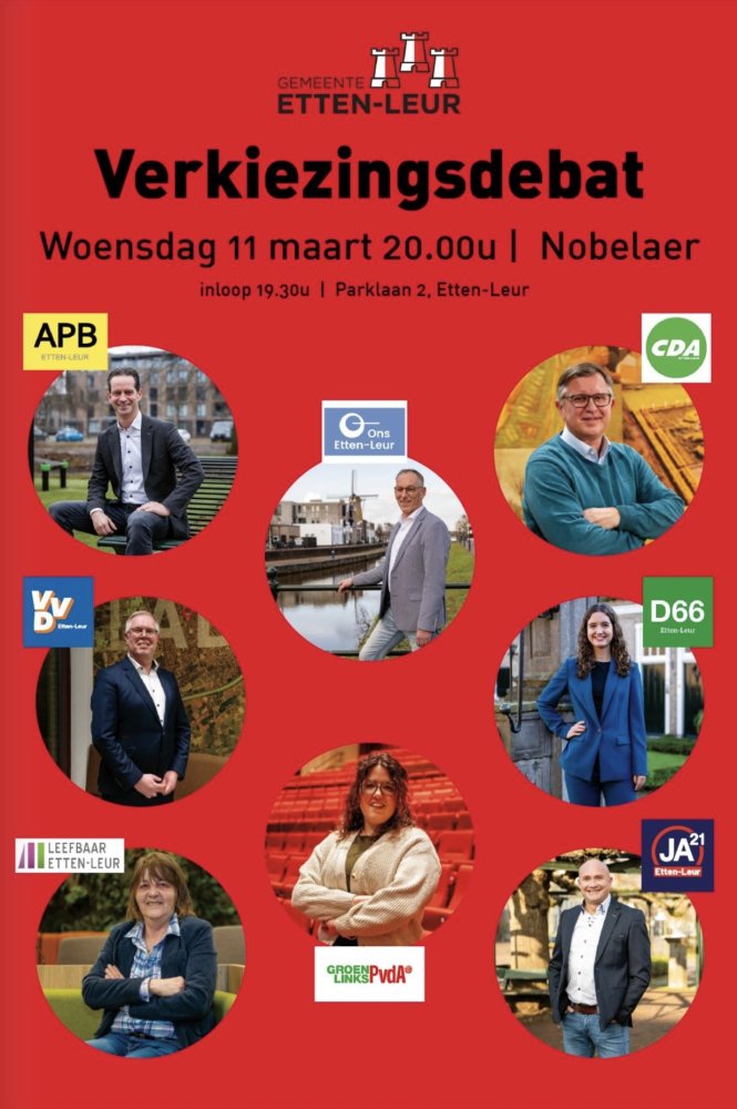 Lijsttrekkers van de acht politieke partijen in Etten-Leur gaan met elkaar in debat. Dat gebeurt op twee momenten en iedereen kan daarbij aanwezig zijn. Het eerste debat, het Verkiezingscafé vindt plaats op zondag 8 maart in De Kapel in het Park en het tweede lijsttrekkersdebat is op 11 maart in De Nobelaer. De gemeenteraadsverkiezingen zijn op woensdag 18 maart. Weet jij al op wie je gaat stemmen?