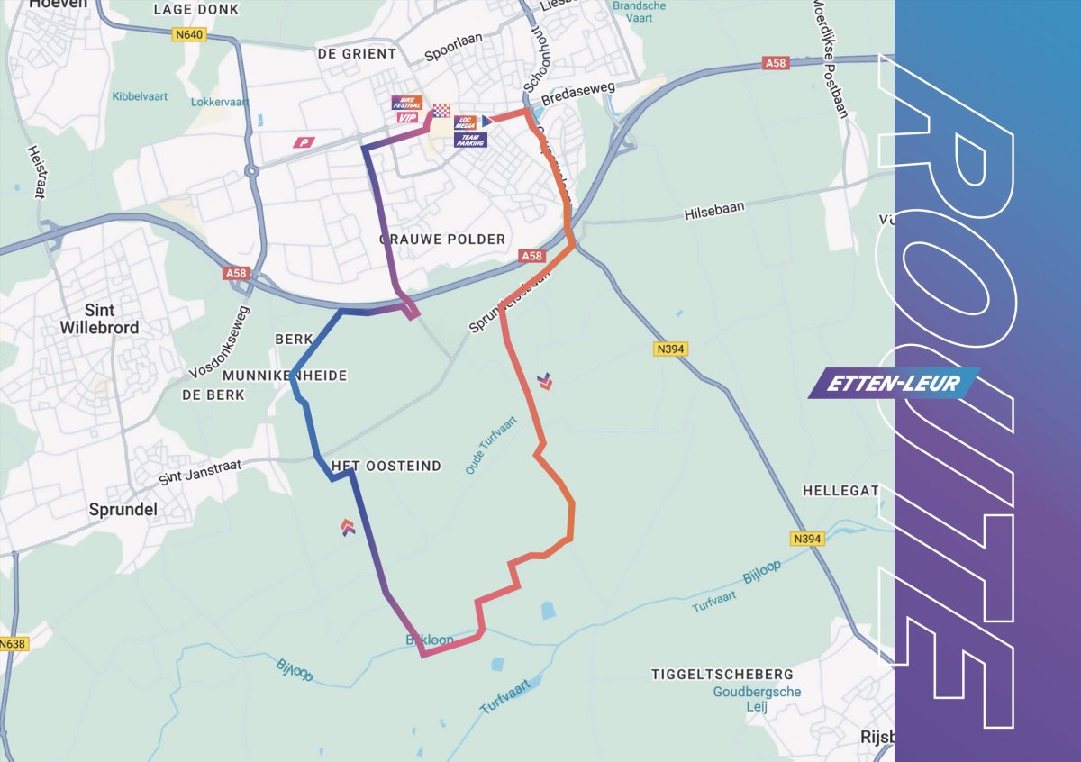De route voert door het zuiden van Etten-Leur, dwars door het Brabantse landschap dat ooit Vincent van Gogh inspireerde. Renners razen langs open weilanden, slingerende polderwegen en prachtige bosgebieden, waar het spel van licht en kleur nog altijd herinnert aan Vincents schilderijen. De tijdrit keert vervolgens terug naar het centrum, waar de finishlijn aan de Oude Bredaseweg wacht te midden van gezellige terrassen en historische gebouwen.