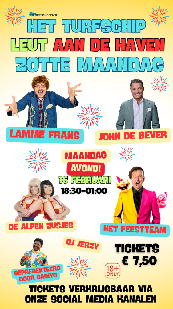 Maandag 16 februari wordt bij Het Turfschip omgedoopt tot Zotte Maandag. Er zijn optredens van Lamme Frans, John de Bever, de Alpen Zusjes en het Feestteam. De DJ is Jerzy en de presentatie is in handen van Bagiyo!