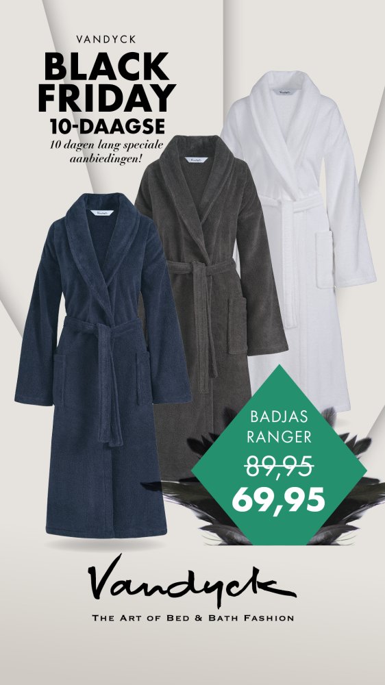 Vandyck Ranger badjassen. 100% Amerikaans katoen van € 89,95 voor € 69,95. Alleen tijdens de BLACK FRIDAY 10-daagse