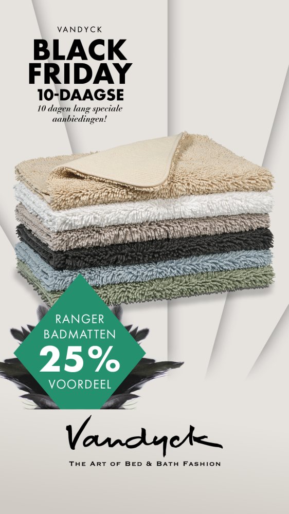 Vandyck Ranger Badmatten, gemaakt van 100% katoen. Deze badmatten voelen heerlijk zacht aan en zijn super absorberend. Alleen tijdens de Vandyck BLACK FRIDAY 10-daagse met 25% voordeel!