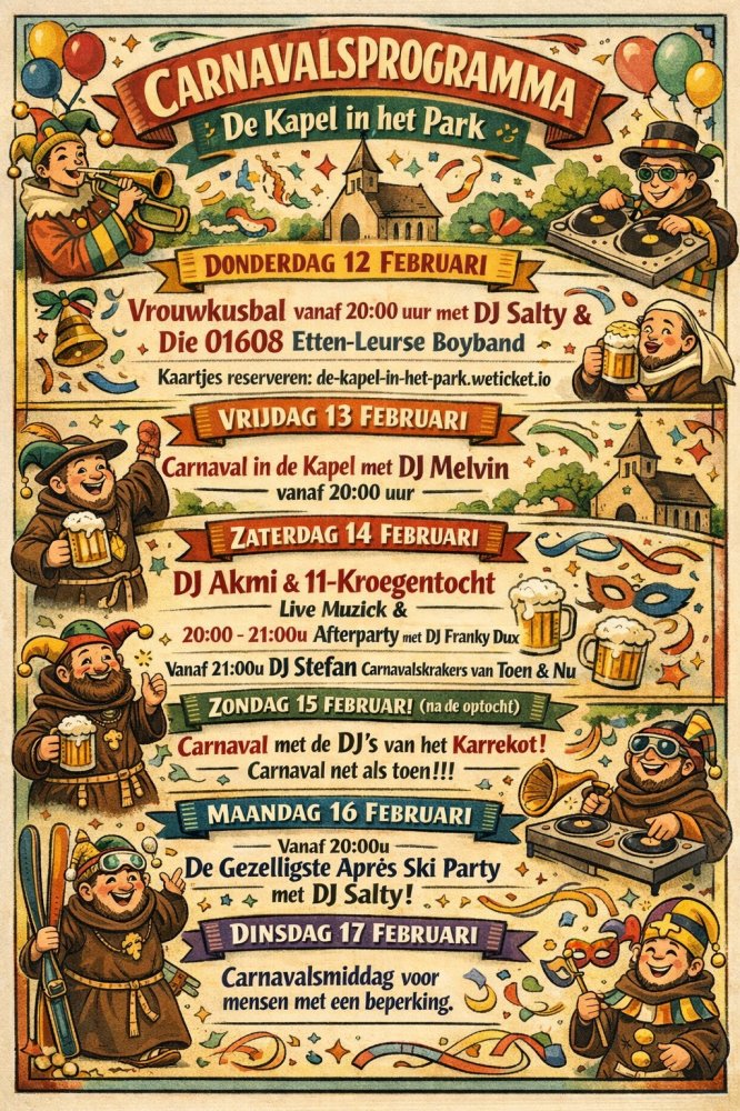 - Vijf dagen carnaval (van vrijdag t/m dinsdag) met Disco Team Djonnies, een live optreden van duo Noit Genog en Dante Deterala (bekend van Sint Willebrord, het Mirakel van Brabant). Lees meer>>